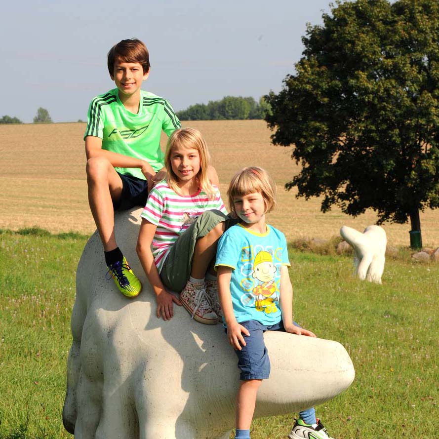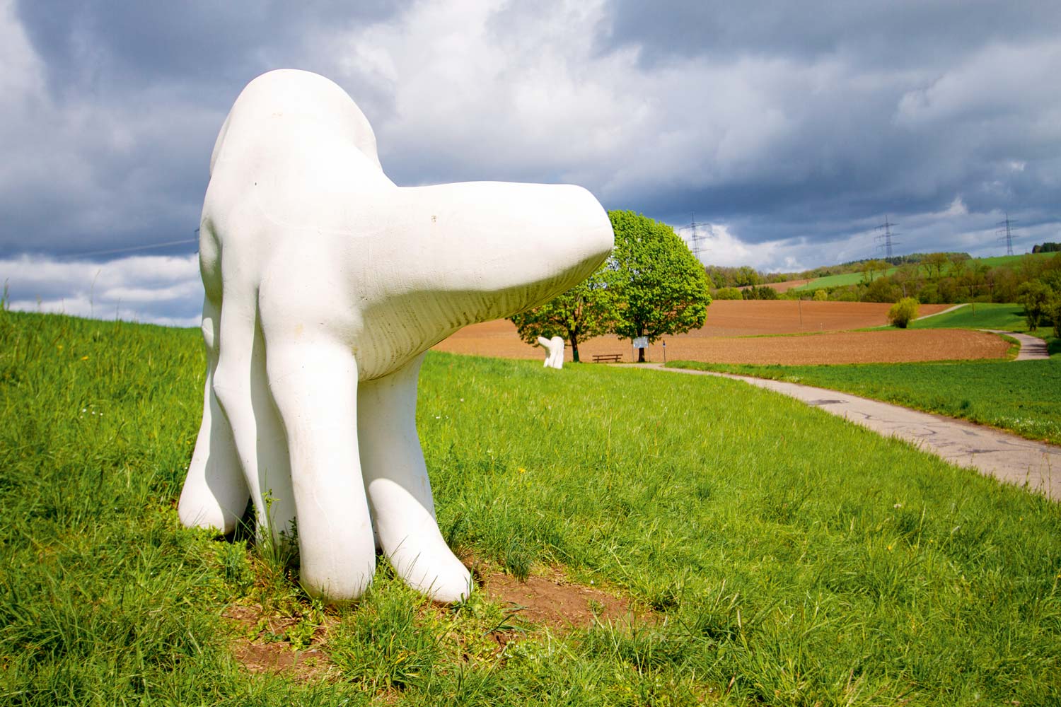 Beide Figuren sind ähnlich in Aufbau und Charakter, jedoch nicht identisch. Sie scheinen sich am Radweg entlang zu bewegen, und ihre Form lädt zum Verweilen und Berühren ein. Ob aus vergangenen oder aus zukünftigen Zeiten: mit ihren archaischen Formen sind die Figuren gleich Fabelwesen nicht in die reale Welt einzuordnen.