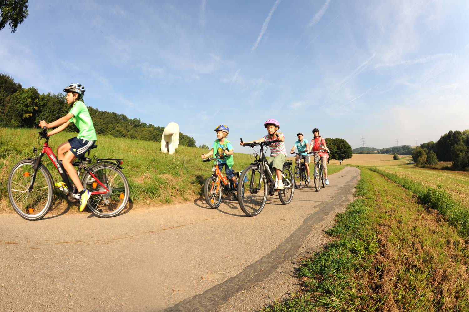 Von weitem nur als ein weißer Fleck erkennbar, begegnen zwei vielbeinige, nicht identifizierbare Wesen dem Radfahrer.