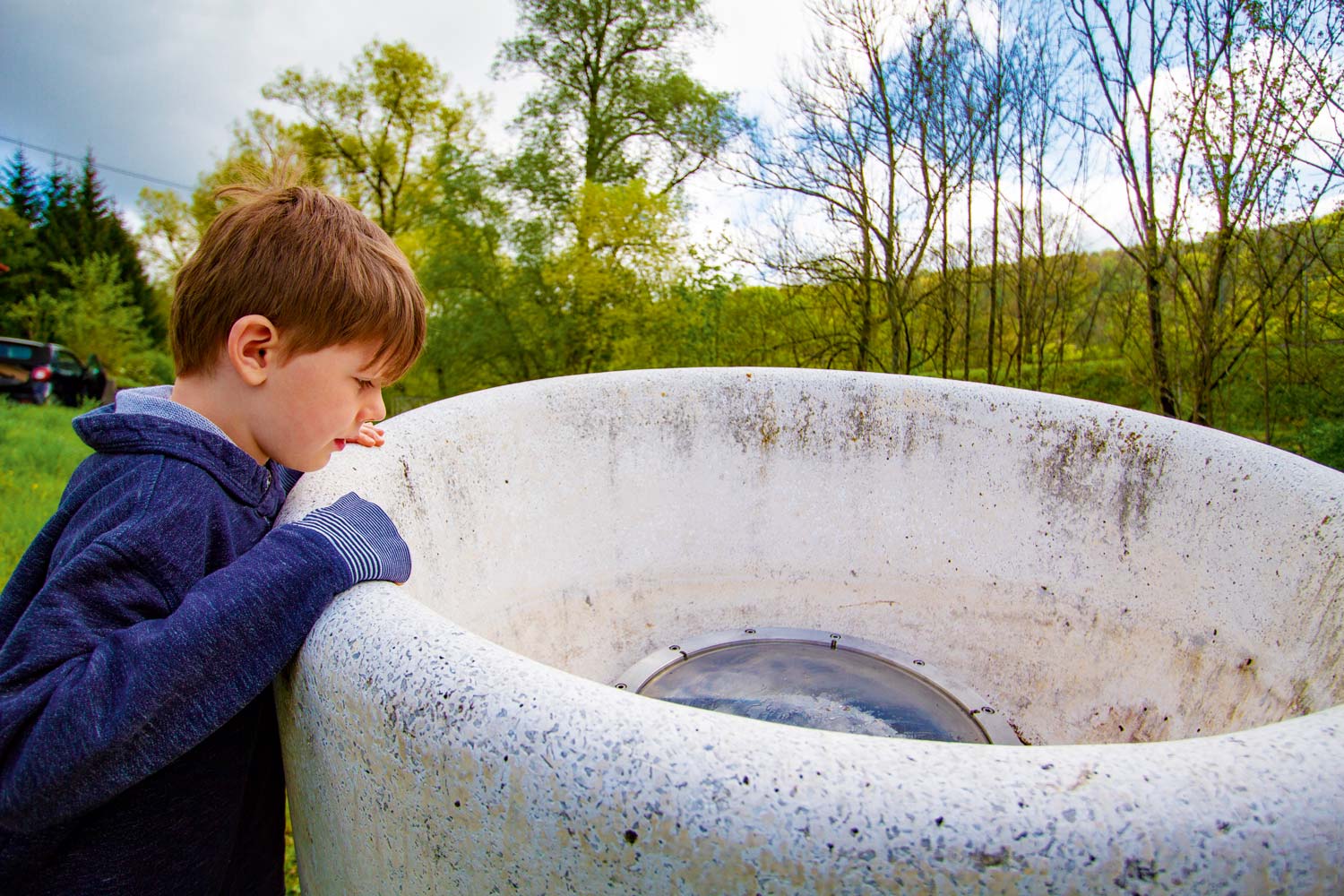 Einen Blick „hinab durch die Mitte“ gewährt der unscheinbare Brunnen mit freier Sicht durch die Erde hindurch, auf die „andere Seite“ des Himmels, die wir von hier aus nicht sehen können. Unter einer Linse befindet sich außerhalb ihres Brennpunktes die Abbildung des Sternenhimmels, die erst mit der Brechung durch Wasser sichtbar wird. Der Brunnen füllt und leert sich in regelmäßigen Intervallen.