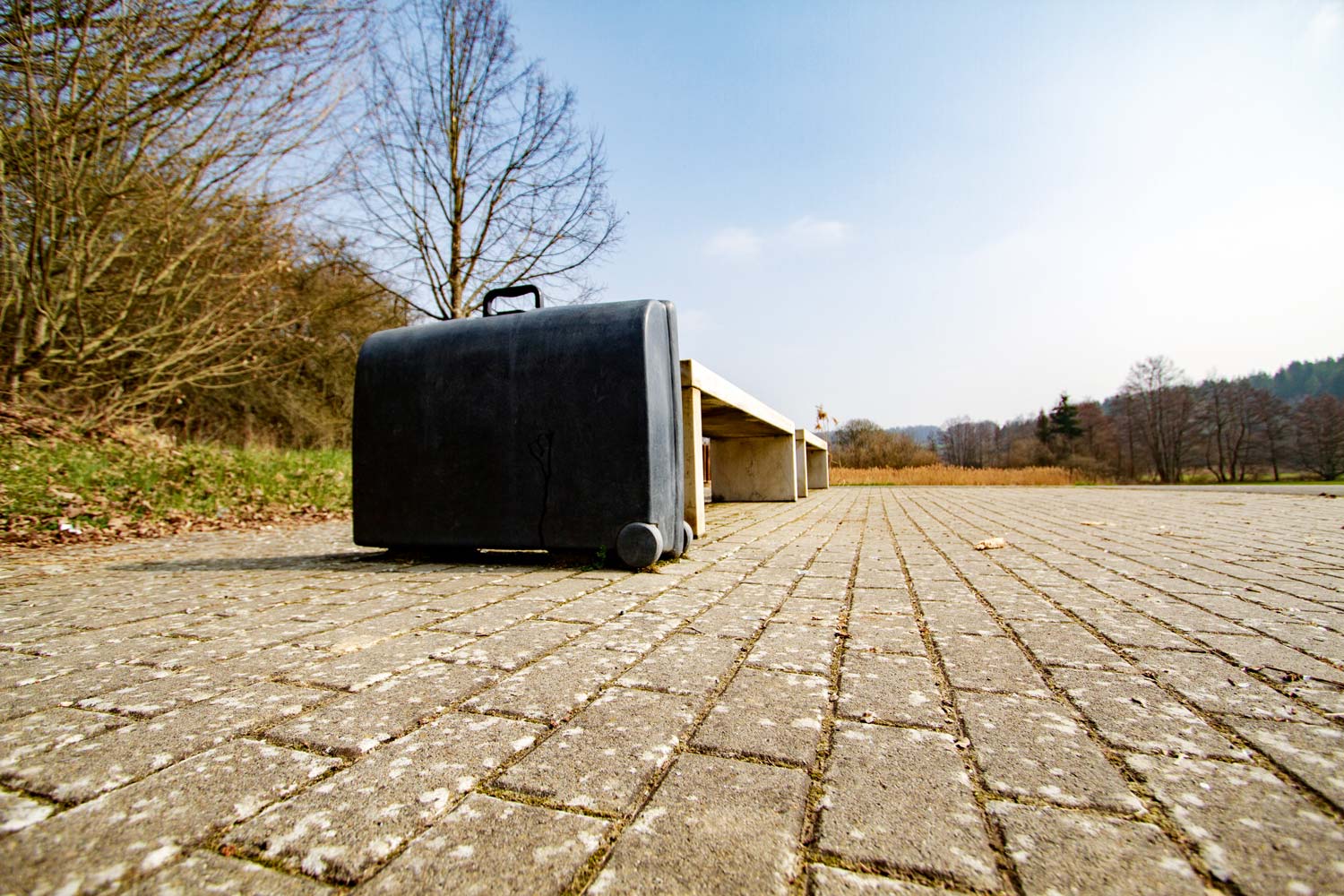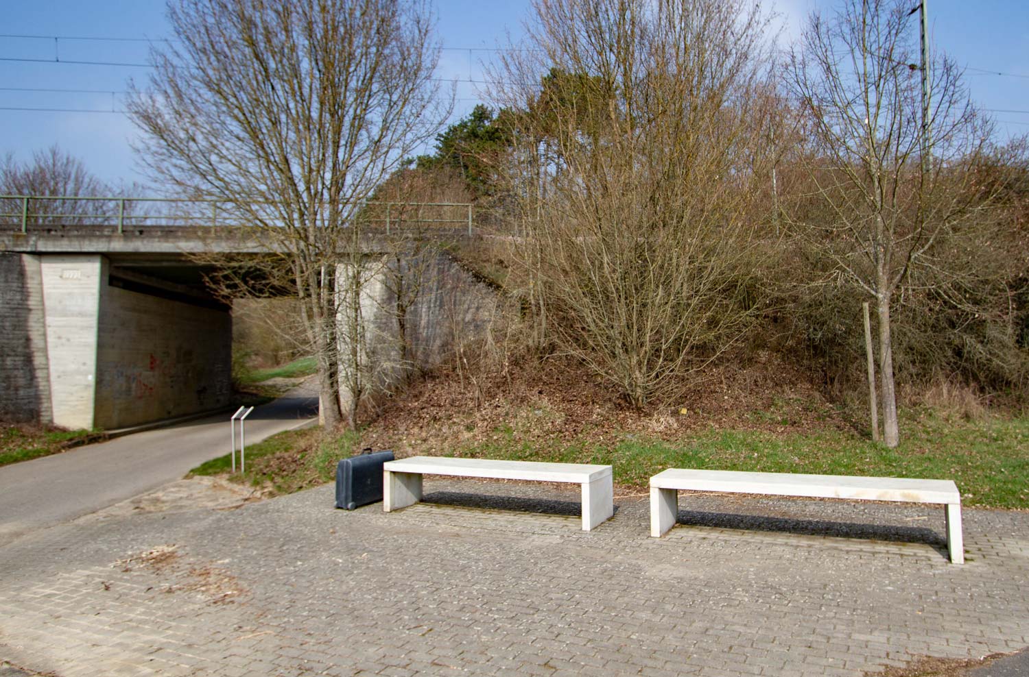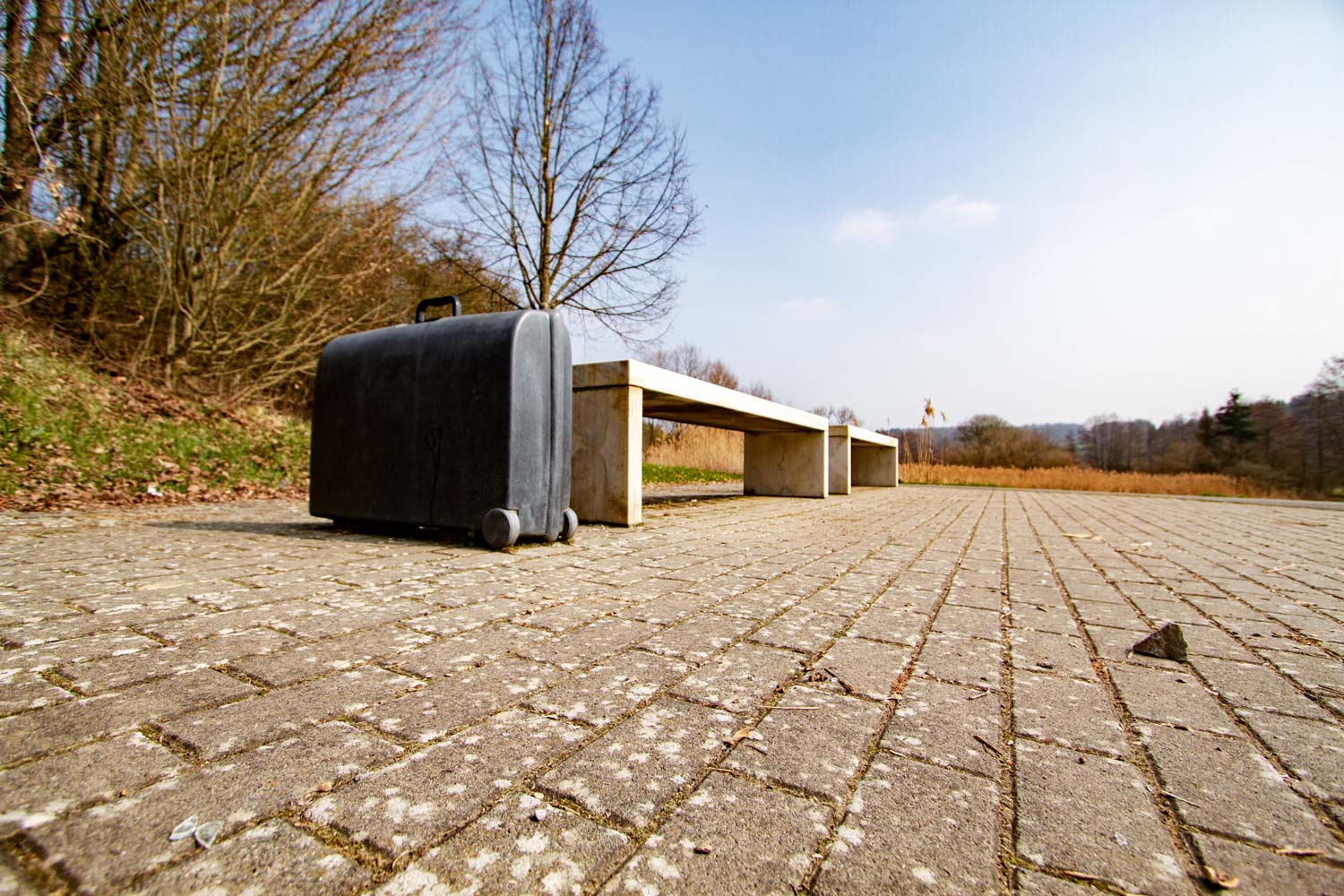 Zwei aus hellem Quarzit gesägte Bänke und ein Koffer aus schwarzem Basalt sind korrespondierend angeordnet.Den Radfahrer werden die Bänke sicherlich zur Rast einladen, der herrenlose Koffer hingegen wirft Fragen auf. Mit der Wahl des Standortes nahe der Eisenbahnlinie verstärkt der Künstler diesen Eindruck. Wann mag der Zug eintreffen, wessen Habseligkeiten stehen hier?Die Anwesenheit dessen, der sein Reisegepäck wie zufällig abgestellt oder vergessen zu haben scheint, ist nicht mehr nachvollziehbar. Man mag sich an Samuel Becketts Stück „Warten auf Godot“ erinnert fühlen, in dem das unaufhörliche Warten dargestellt wird, das Warten abseits oder außerhalb der Zeit.