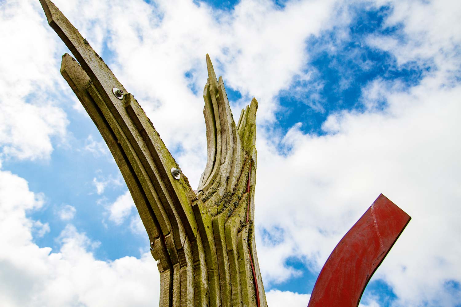Eine gefällte Eiche aus der unmittelbaren Umgebung wurde in Bretter zerlegt, einem Stahlkern angepasst und anschließend wieder zu einem Ganzen zusammengesetzt.