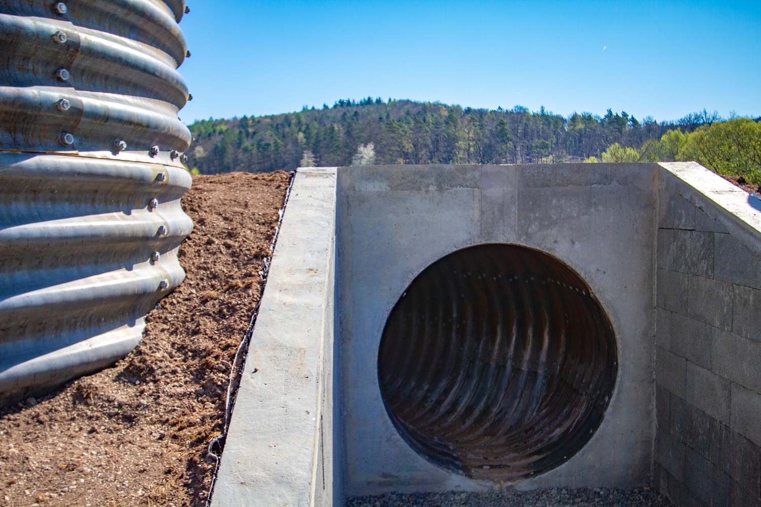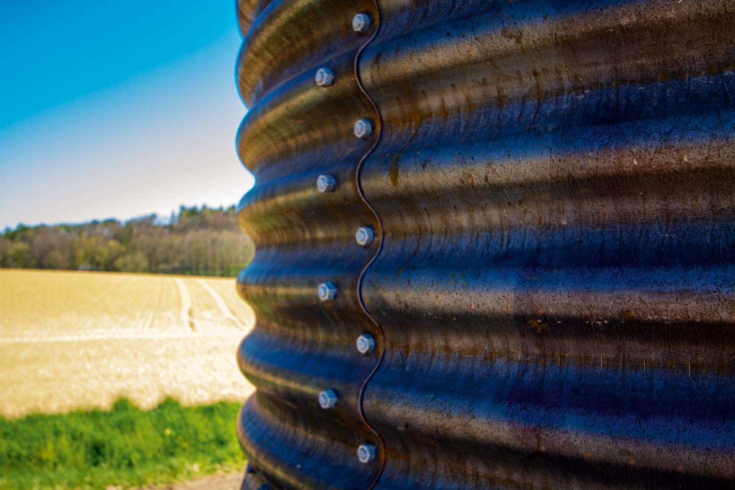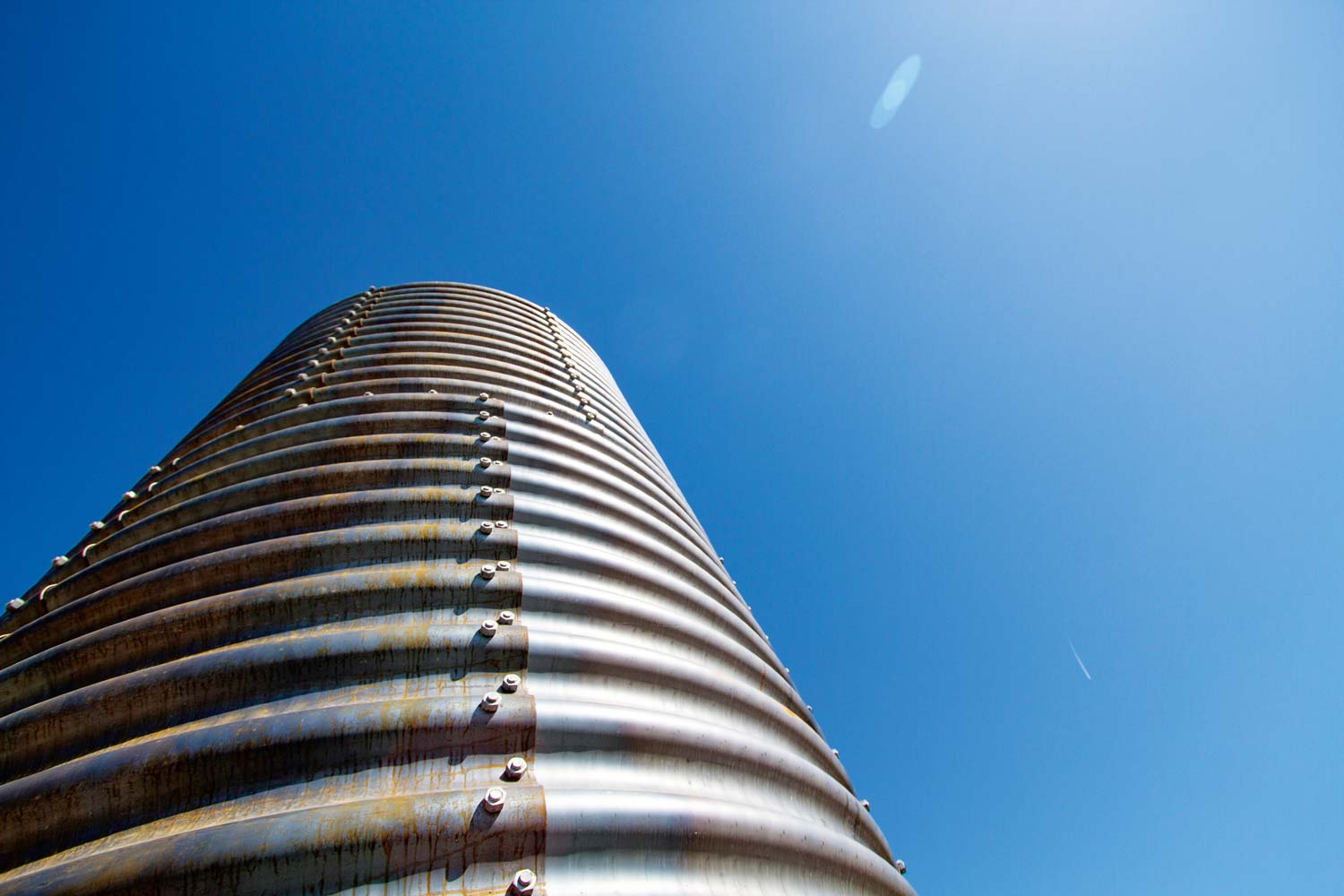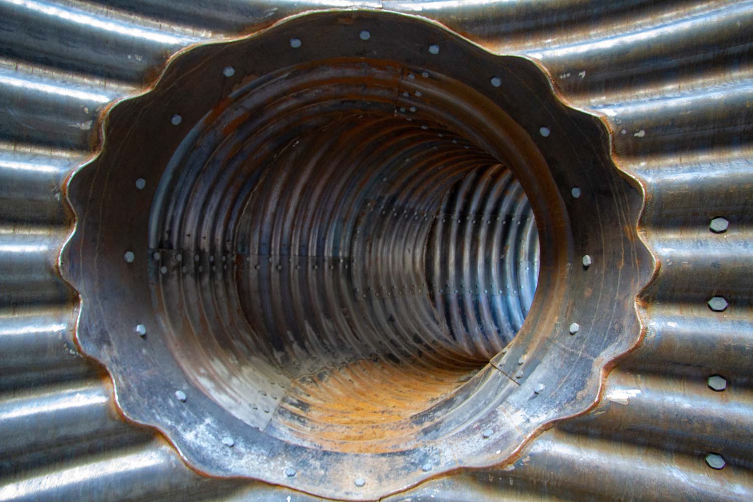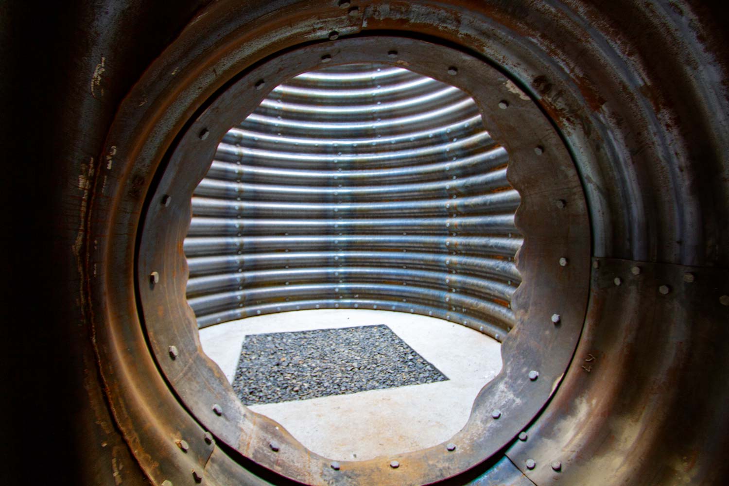 Der schmale Weg führt über zwei Knickstellen in das Innere eines Zylinders: Es ist das Gefühl, eine Parallelwelt zu betreten – aufregend, beklemmend. Der kreisförmige Raum hat eine Höhe von sieben Metern. Er ist zum Himmel geöffnet – die einzige Lichtquelle in diesem Raum innerhalb des Erdreichs.